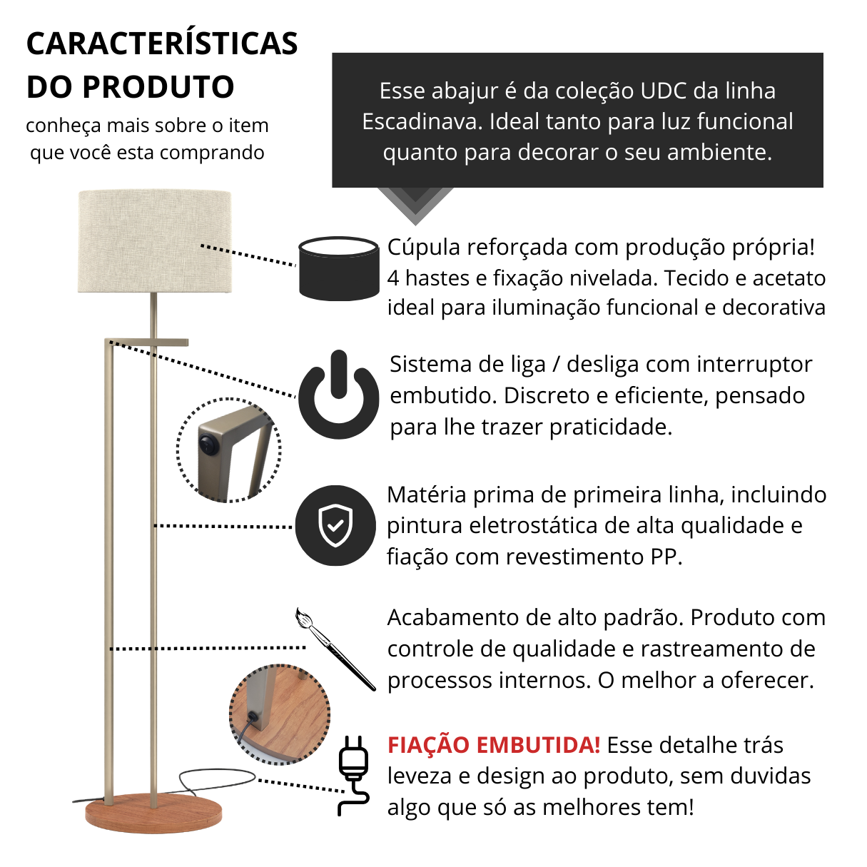 A Luminária Salone é produzida com materiais selecionados, garantindo resistência, durabilidade e acabamento premium:
